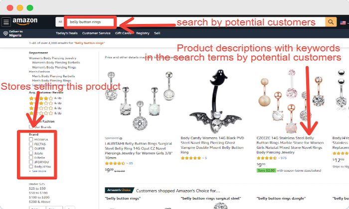 Let’s assume you sell belly button rings, and someone goes on Amazon to search for it: