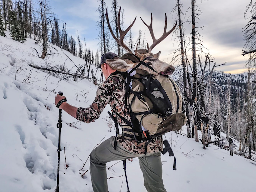 Hauling bulky items during hunting is common and involves hauling things like weapons, ammo, and hunting backpacks. Trekking poles assist in shifting part of the weight from the lower body to the upper body, relieving pressure on the lower back and legs.