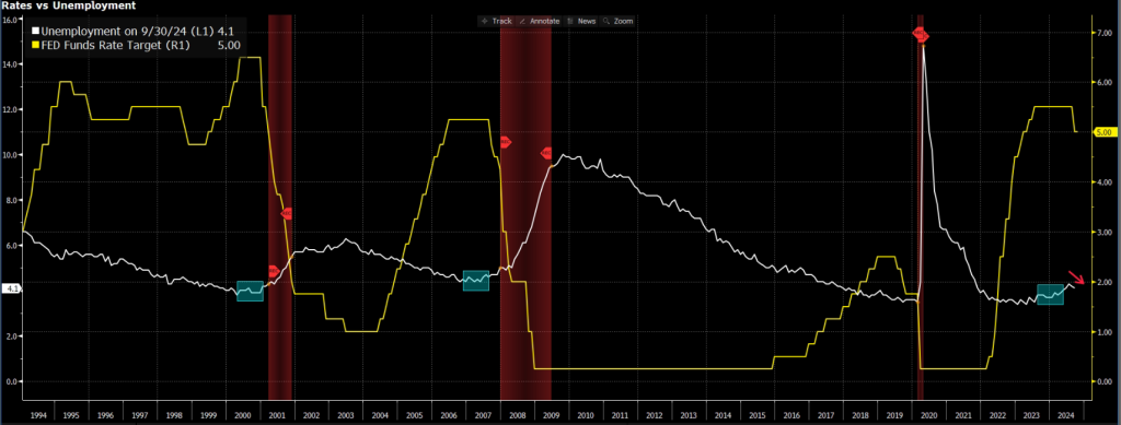 Dubai,UAE,Oct 18,2024-The Federal Reserve (FED) has begun its rate-cutting cycle with a 50-basis-point cut in the September meeting, similar to the first cut in 2007. This significant reduction was prompted by the recent spike in the unemployment rate. In June, the Federal Reserve projected that unemployment would be 4% by the end of the year, but just two months later, it has already reached 4.3%. Historically, when unemployment rises this quickly, the trend often continues for several months.