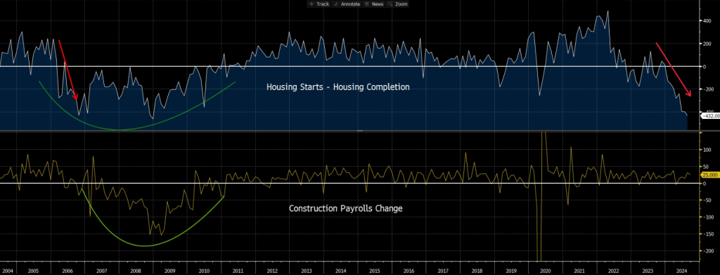 If we take a closer look at the economy, there are both positives and negatives at play. One red flag is emerging from the construction sector. The spread between housing starts and housing completions has fallen into negative territory and has remained there since the start of the year. This indicates that active construction projects are steadily declining. Despite this, construction payrolls have continued to rise.