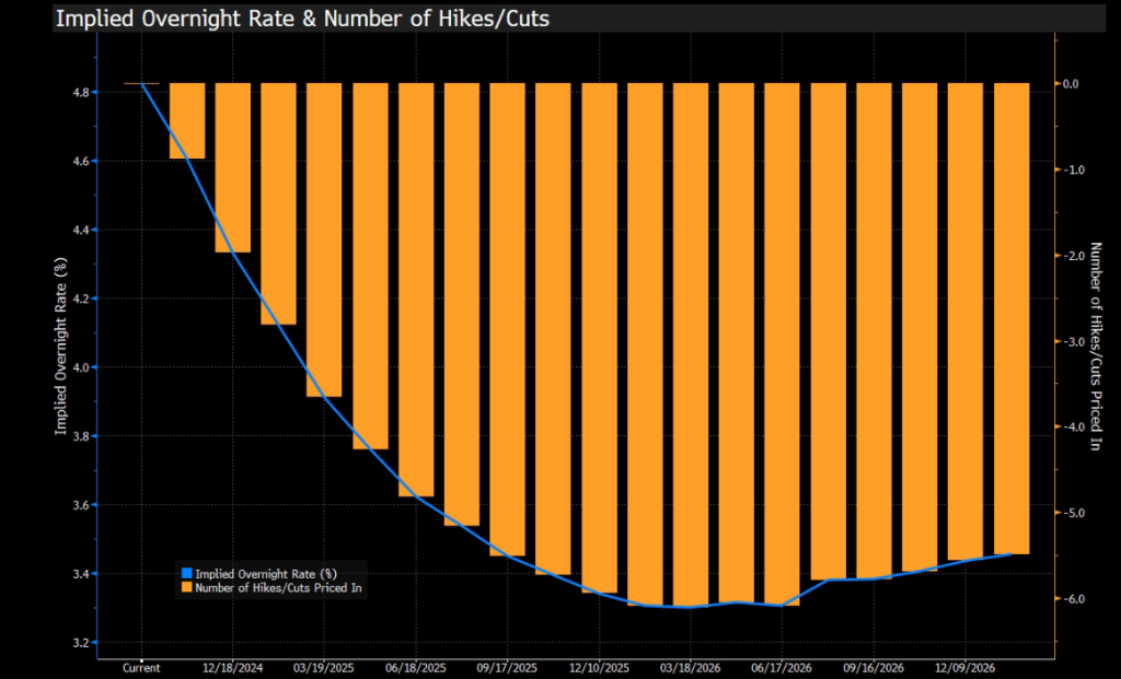 Markets expect the FED to lower the federal funds rate to 3.5% by the end of 2025, implying six 25-basis-point cuts, including the two cuts anticipated this year. This scenario appears rational, given the risks and the economy’s strong points. However, if unemployment rises sharply and the low savings rate can no longer compensate for the income shortfall, the likelihood of a hard landing will increase significantly, potentially leading to more aggressive rate cuts, bringing rates below the projected 3.5%.